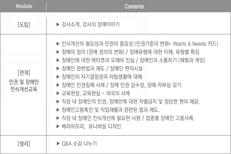 장애인 인식 개선와 그 필요성 인권의 중요성에 관한 컨텐츠를 기획하고 교육하고 있습니다.