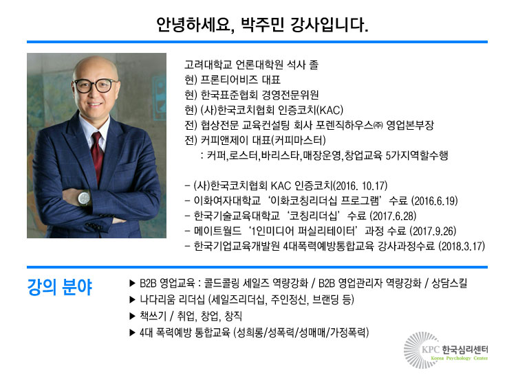 안녕하세요, 국내1호 콜드콜링전문가이자, 2018, 대한민국 명강사 경진대회에서 최우수상을 수상한 박주민 강사입니다.