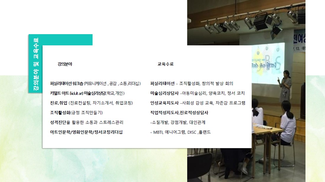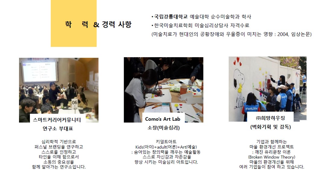 숨어있는 창의력을 깨우는 예술 활동과 미술심리를 바탕으로 잠시 숨겨둔 나를 찾는 여행, 우리를 찾는 여행을 도와드리겠습니다